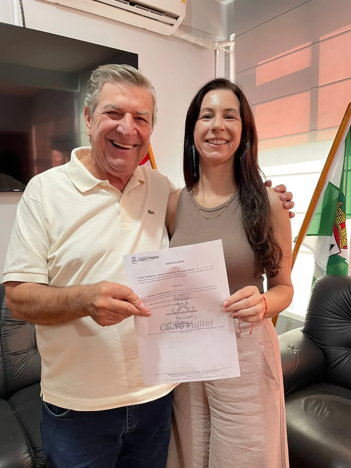 O prefeito Valdir Fontanella oficializou nesta quarta-feira (1) a nomeação de Josiane Girardi como nova Secretária de Administração do município. Servidora de carreira há 19 anos, ela assume a função após trajetória consolidada dentro da estrutura pública, tendo atuado em diferentes setores da prefeitura ao longo desse período.